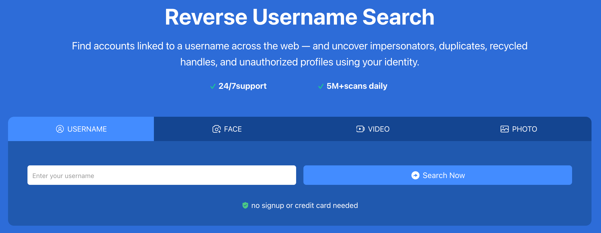 Instead of manually checking individual platforms, reverse username search allows you to locate accounts that are copying, imitating, or exploiting your username — or close variations of it — across social media and the wider web.