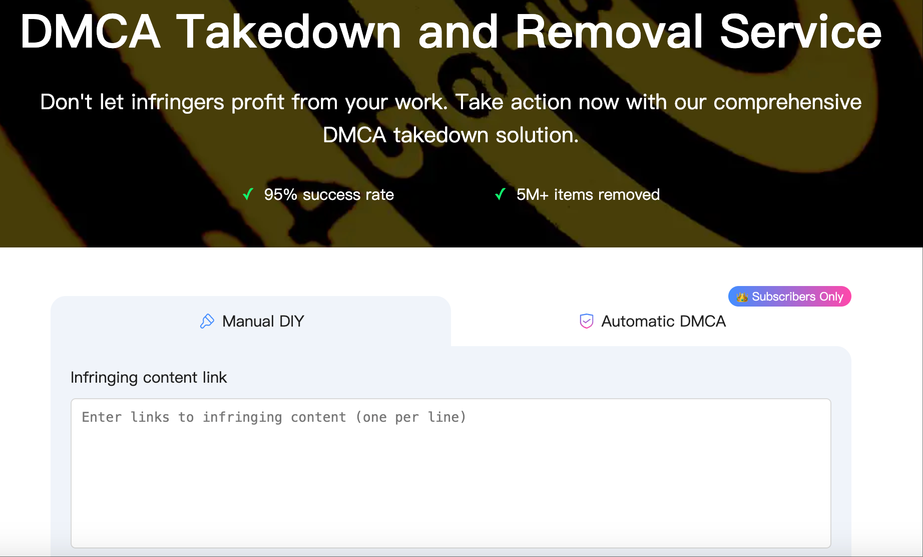 - Presenta automáticamente solicitudes DMCA a Google + proveedores de hosting